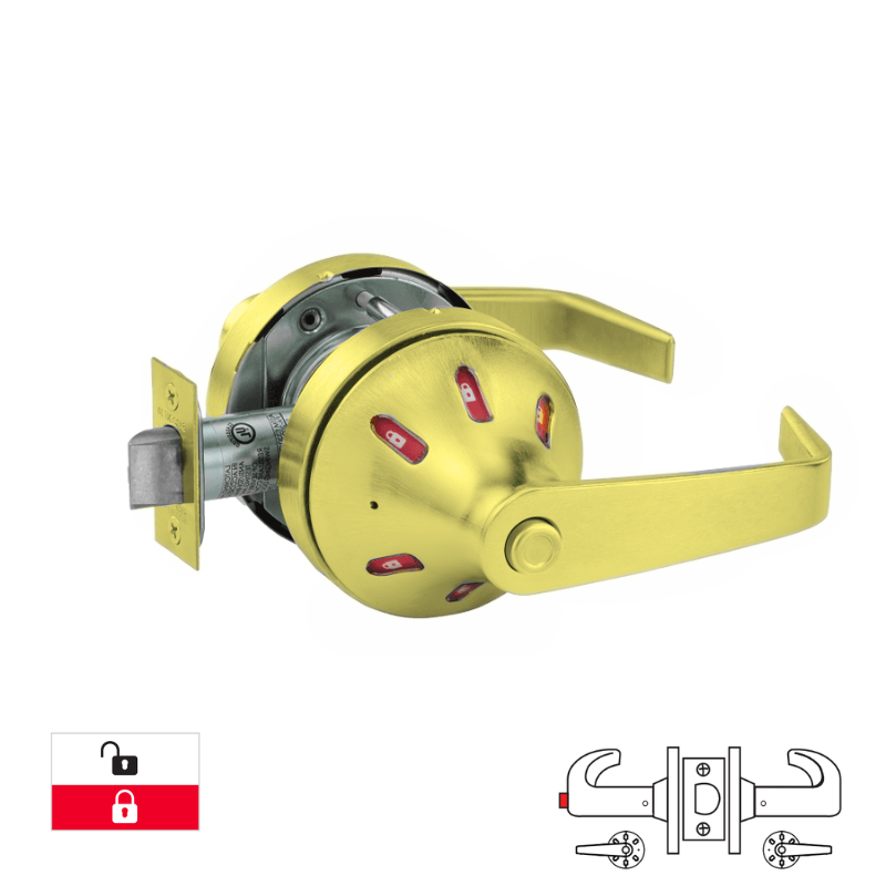 Sargent V66-10XU65-VSLL is a Grade 1 privacy lock designed for bathroom use featuring a cylindrical mechanism with a “VSL” rose and an “L” lever style. It includes a dual-sided visual indicator in white and red for occupancy status. The lock has a 2 3/4-inch backset and a 4 7/8-inch strike plate and comes non-keyed.
